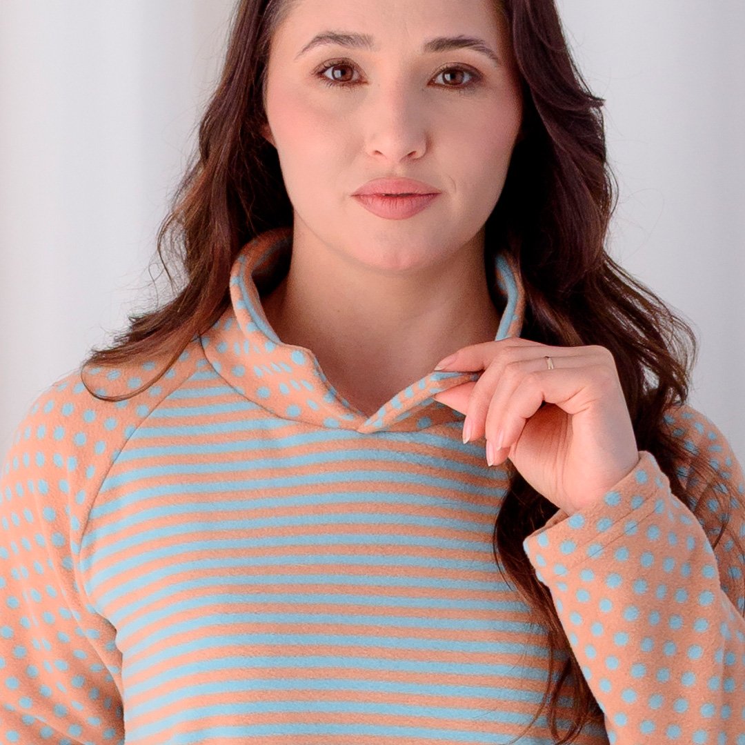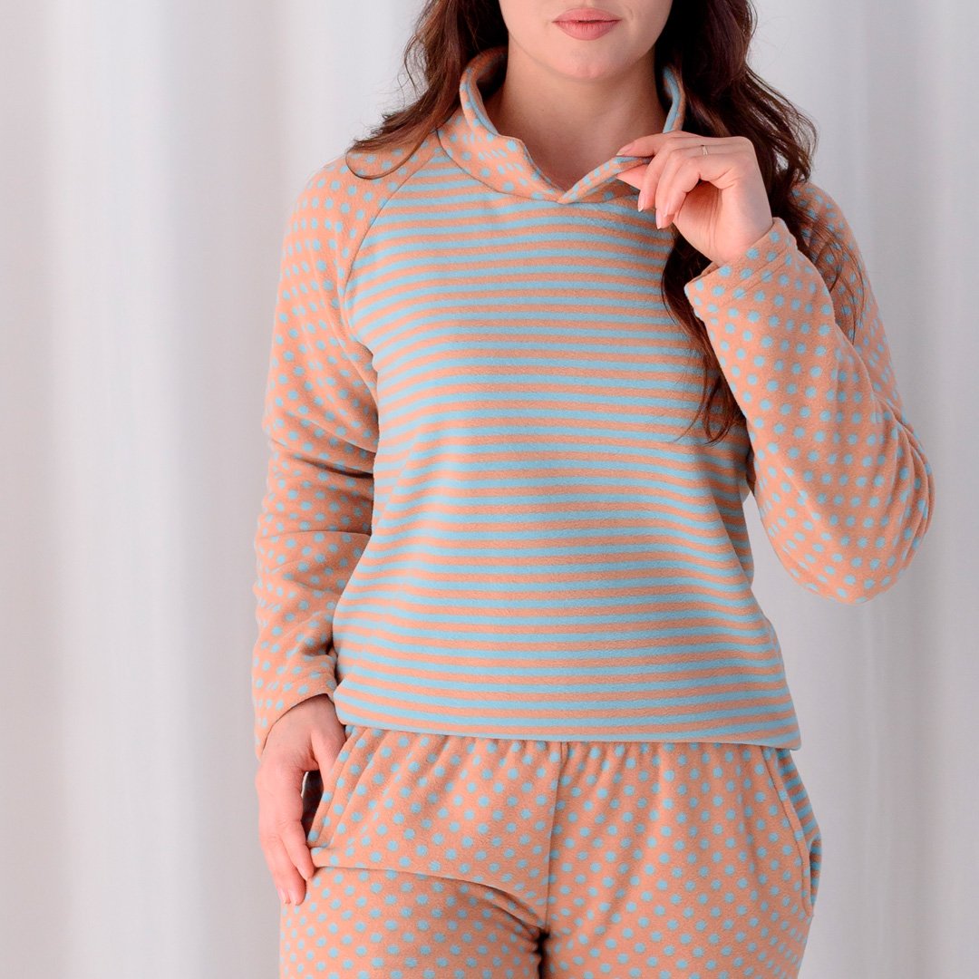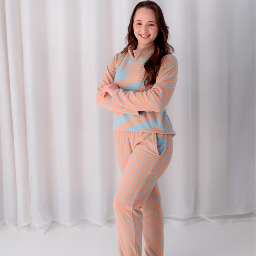 A blusa de manga longa combina listras suaves no corpo com mangas em poá, criando um visual moderno e feminino. A calça acompanha a estampa de poá, com caimento confortável que garante liberdade de movimentos sem apertar.