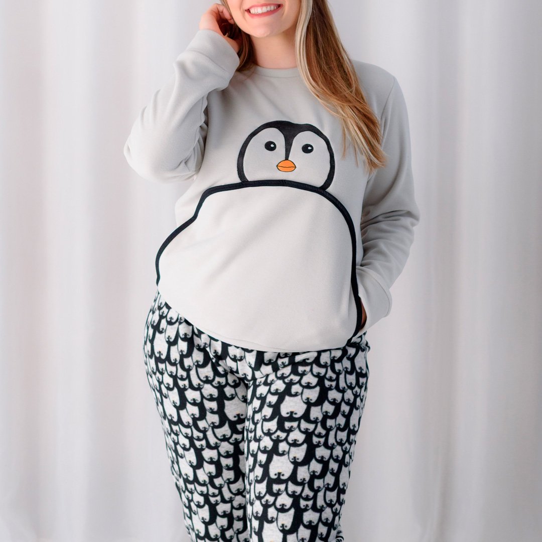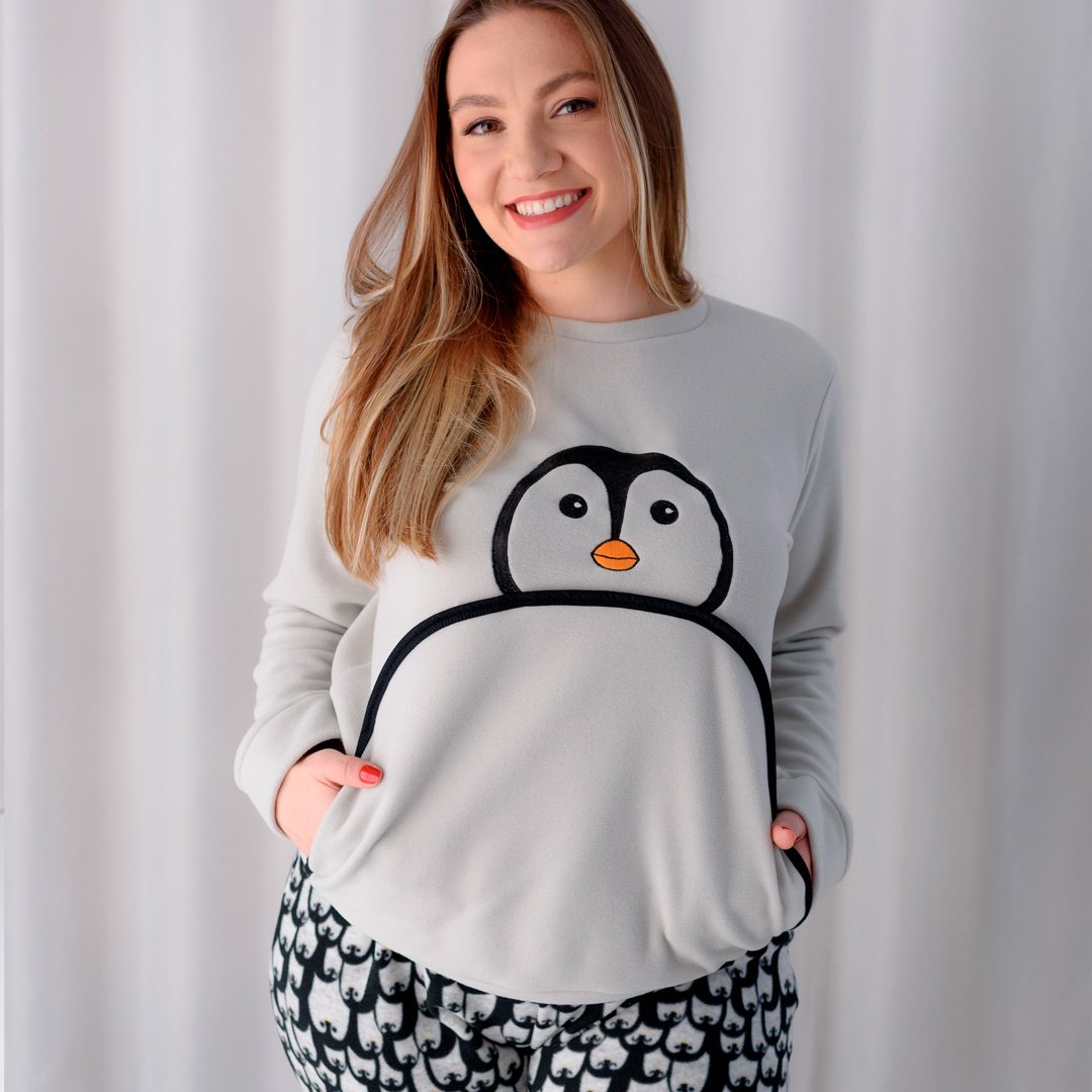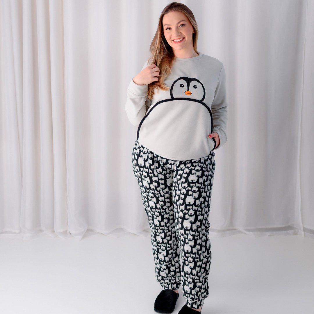 A blusa de manga longa traz uma estampa fofa de pinguim, que adiciona charme e personalidade à peça, além de contar com bolso funcional que deixa o visual ainda mais despojado. A calça estampada complementa o conjunto com conforto, ótimo caimento e liberdade de movimentos.