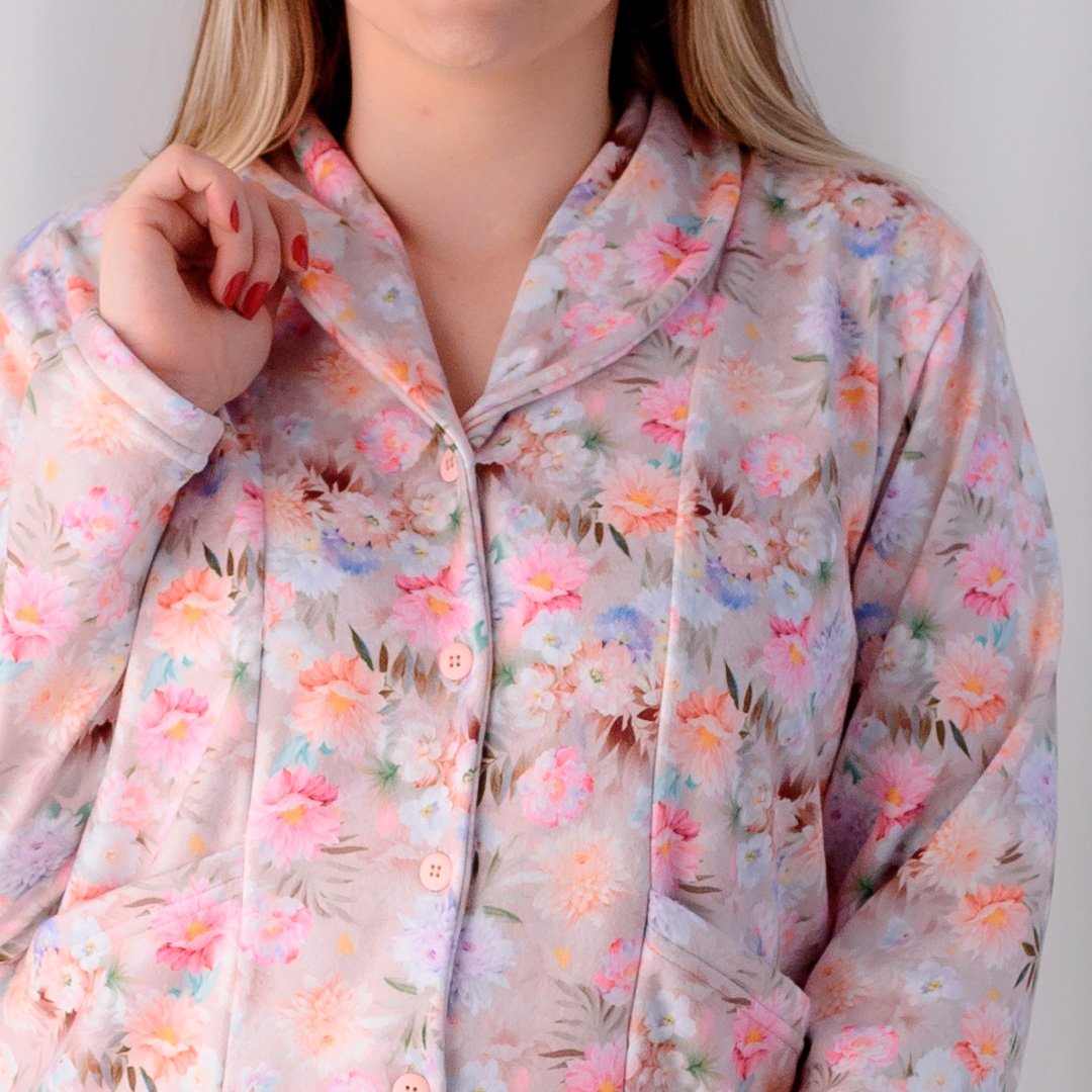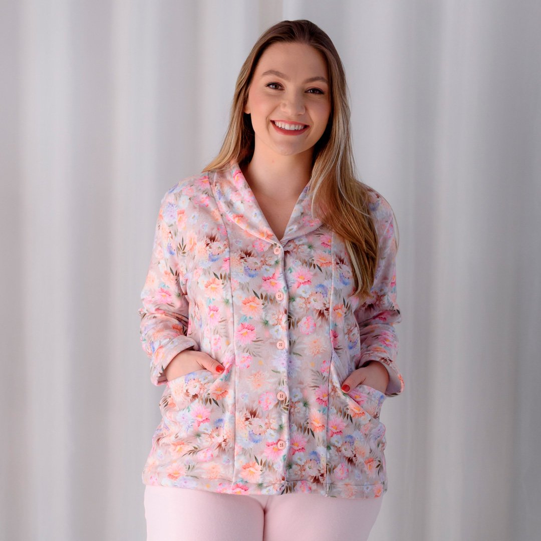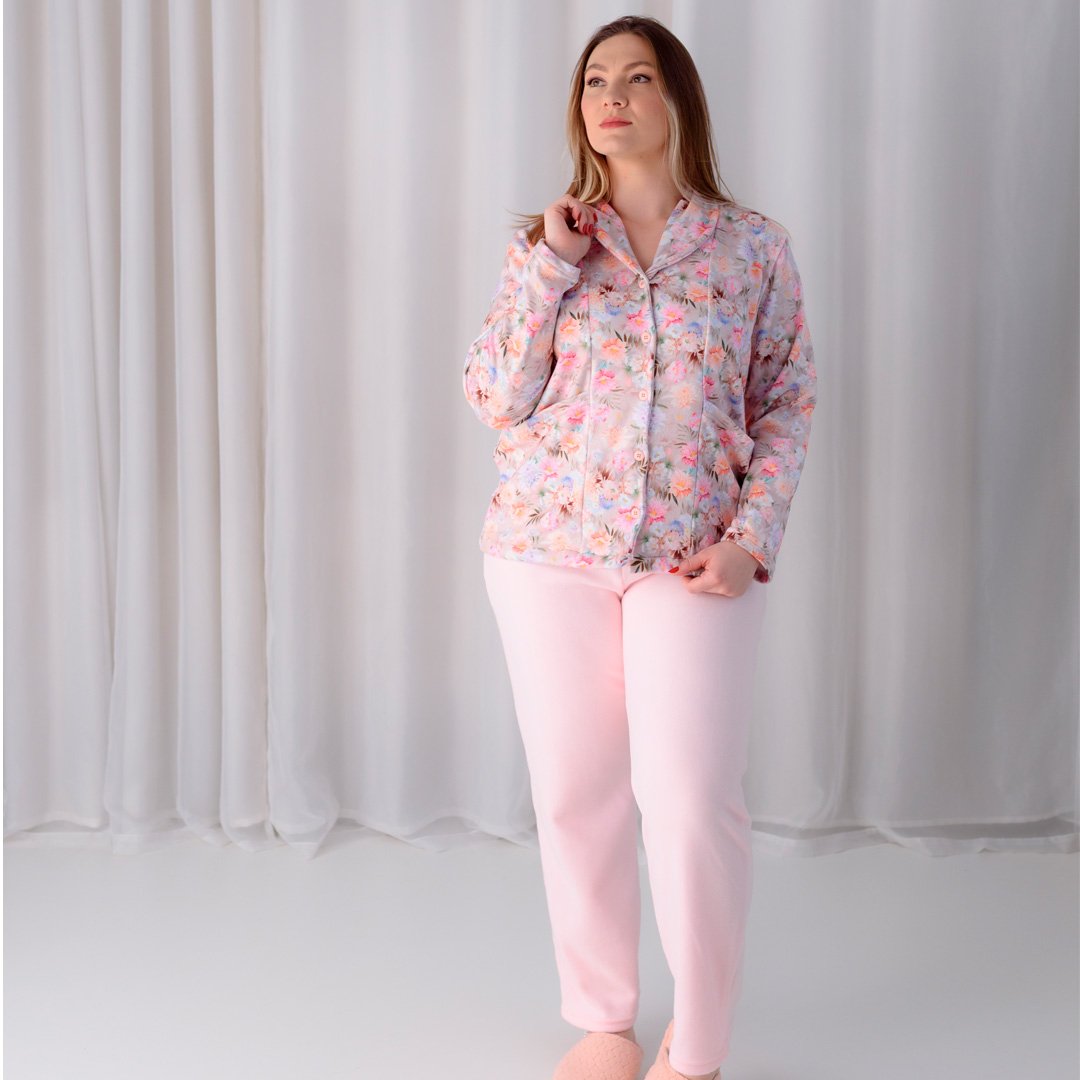 A blusa de manga longa com abertura frontal e botões traz praticidade e um charme clássico, valorizado pela estampa digital floral suave e romântica. A calça lisa completa o conjunto com caimento confortável, garantindo liberdade de movimentos e bem-estar durante todo o uso.