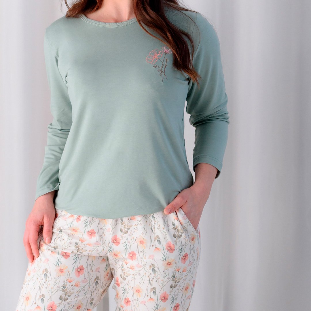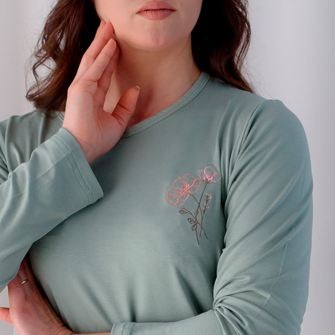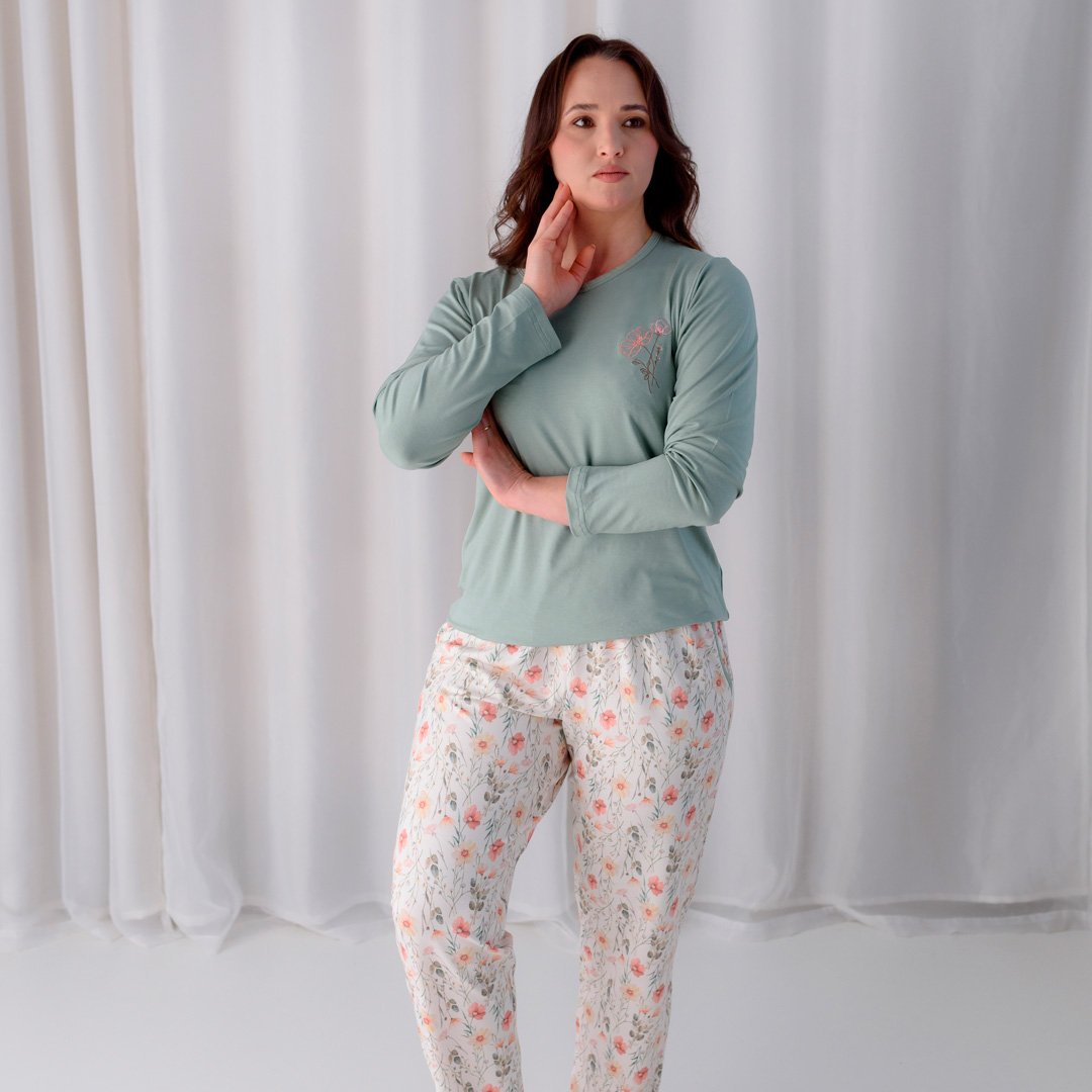 Delicado, confortável e cheio de charme. Esse pijama em viscose foi pensado para quem valoriza noites tranquilas sem abrir mão do estilo. A blusa de manga longa em tom verde suave traz um toque de serenidade e detalhe floral delicado, enquanto a calça estampada adiciona frescor e feminilidade ao visual.