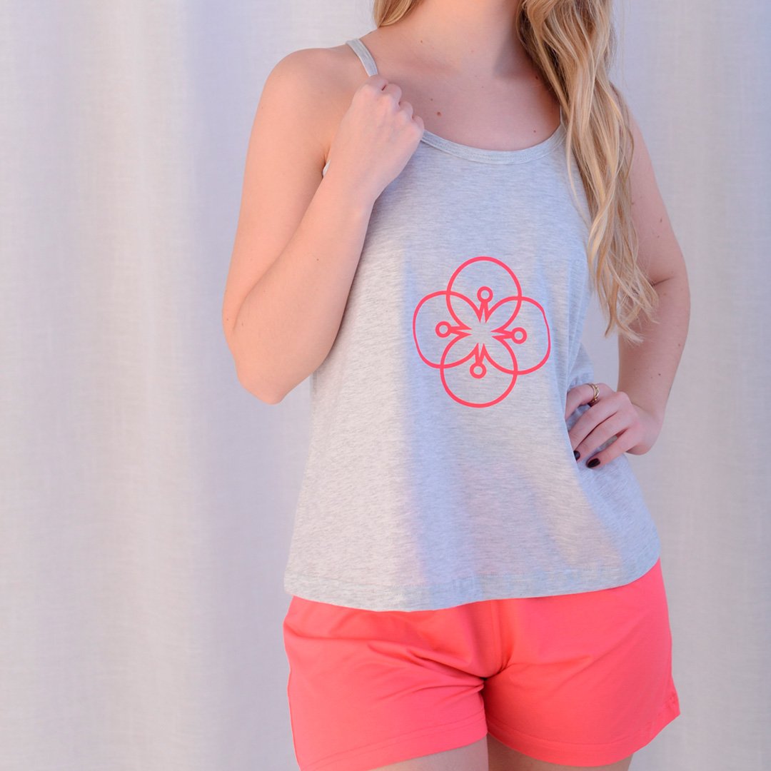 A blusa em cinza mescla, com aplicação em estampa colorida, combinando com a cor do short.. é o equilíbrio entre frescor, modernidade e cor.