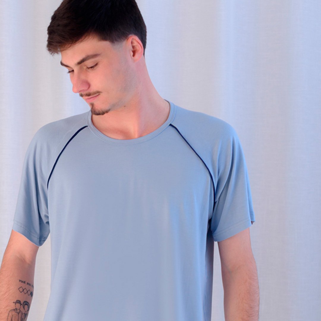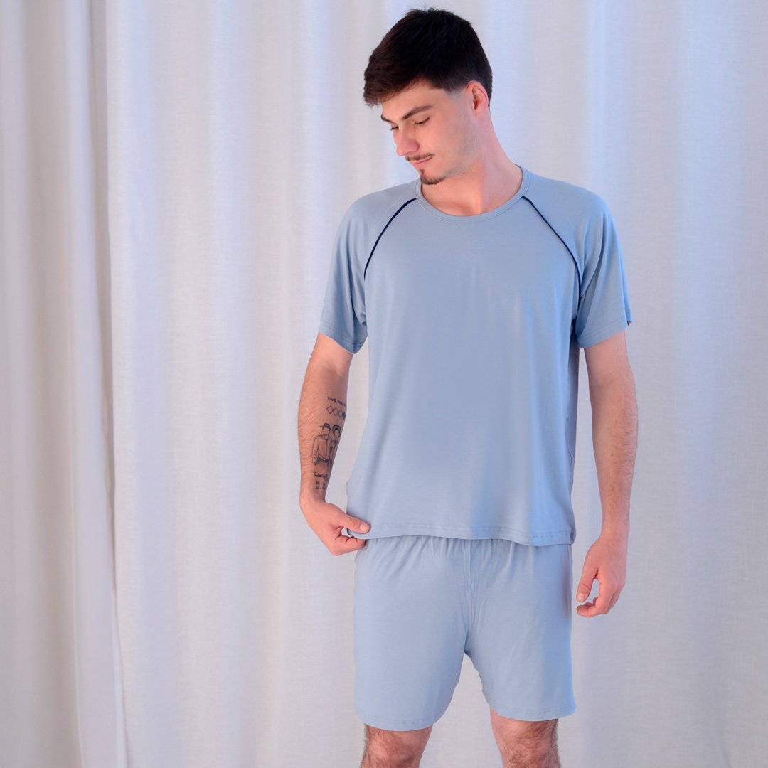 Um conjunto básico com as mangas em corte raglã, e shorts soltinho, é perfeito para dormir ou pra relaxar com total liberdade de movimento.